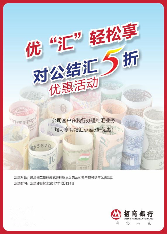 近日,記者從招行深圳分行了解到,自2017年8月1日至2017年年底,招商銀行深圳分行特別推出結(jié)匯尊享優(yōu)惠活動。活動期間,凡公司客戶,可在招商銀行深圳分行轄內(nèi)(含珠海分行及惠州分行)任一網(wǎng)點通過掃描指定二維碼進行登記,登記后辦理結(jié)匯業(yè)務(wù)即可享受結(jié)匯點差五折優(yōu)惠。(張怡)