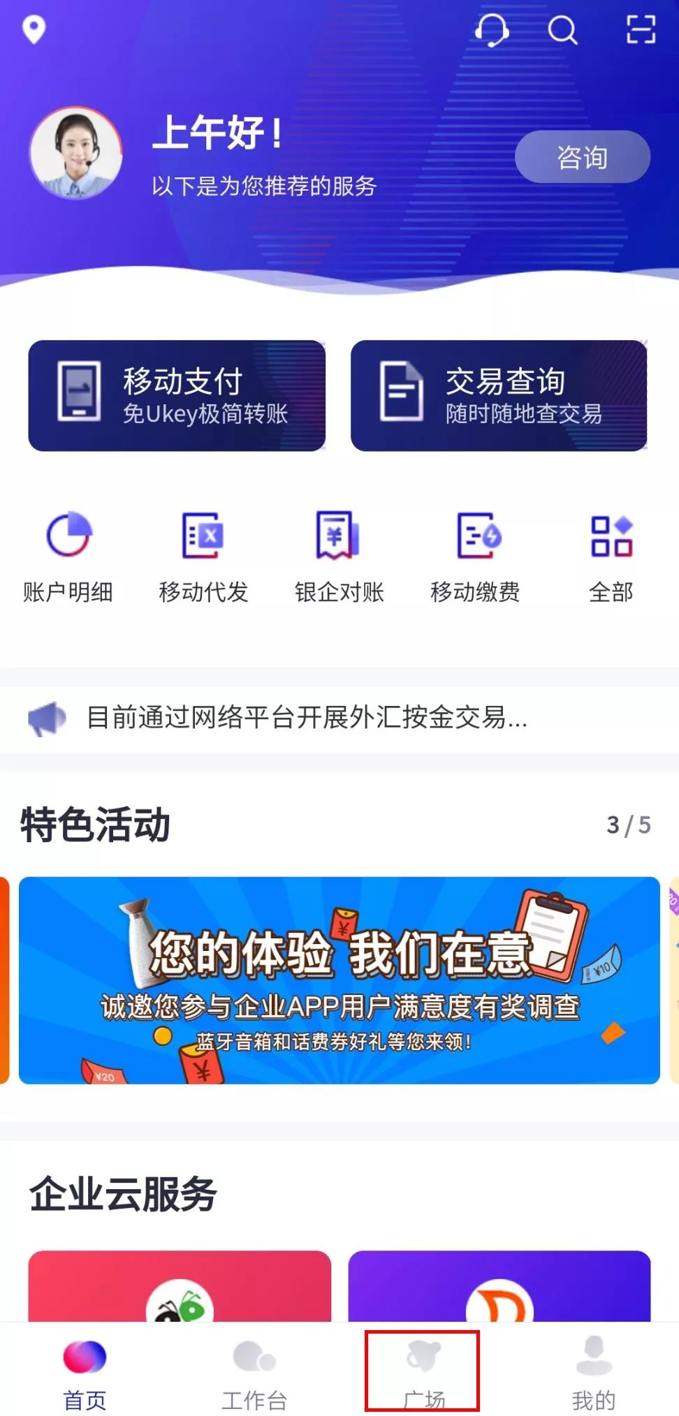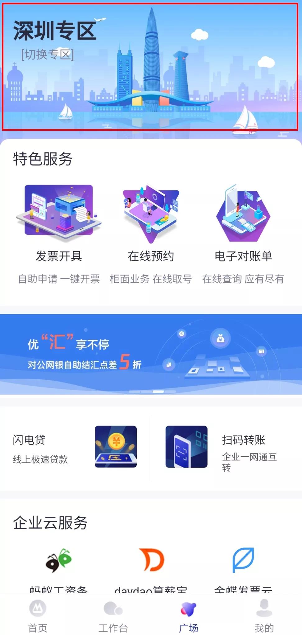 打開招商銀行企業App,點擊“廣場”板塊,找到深圳專區。