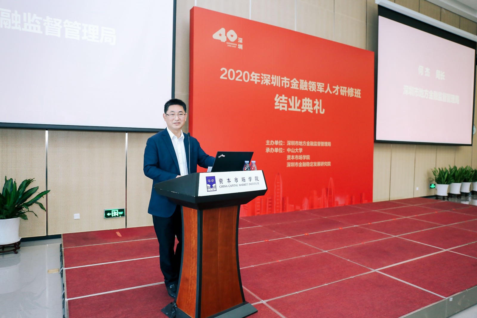 1月30日上午,2020年深圳金融領軍人才研修班結業典禮在資本市場學院隆重舉辦。本期研修班由深圳市地方金融監督管理局主辦,中山大學、資本市場學院、深圳市金融穩定發展研究院共同承辦。市地方金融監管局黨組書記劉平生主持結業典禮并致辭,局長何杰作總結講話。資本市場學院副理事長、深圳市原副市長唐杰教授,資本市場學院黨委書記陳自強、院長金立揚、副院長張韶輝,深圳銀保監局副局長陳飛鴻、深圳證券交易所紀委書記邢力紅,市地方金融監督管理局副巡視員林居正,中山大學嶺南學院院長陸軍教授,以及市委組織部、人民銀行深圳市中心支行、深圳證監局有關領導應邀出席,本期研修班近110名學員參加活動。