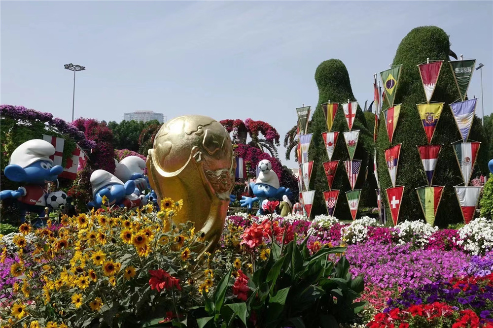 4500萬株鮮花以不同的主題分區布展,今年的主題包括野生動物保護、卡塔爾世界杯、藍精靈等。李仁奇 攝