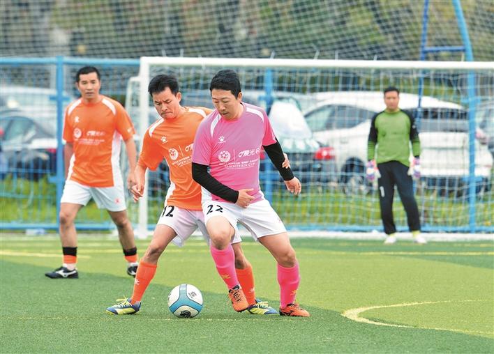 ▲“深圳杯”媒體賽,深圳特晚聯隊球員(右一)積極拼搶。