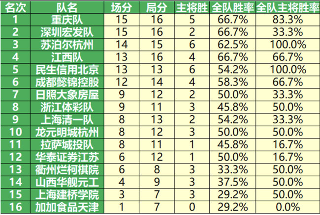《2020年華為手機杯中國圍甲聯賽第六輪積分榜》