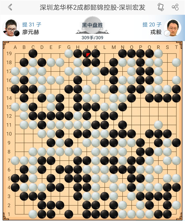 第三臺戎毅對陣廖元赫,開局行至第30、32手時出現失誤,致一隊白子被殲。此后,雖一路奮力追趕,行至309手時依然無力回天,遂認輸告負。