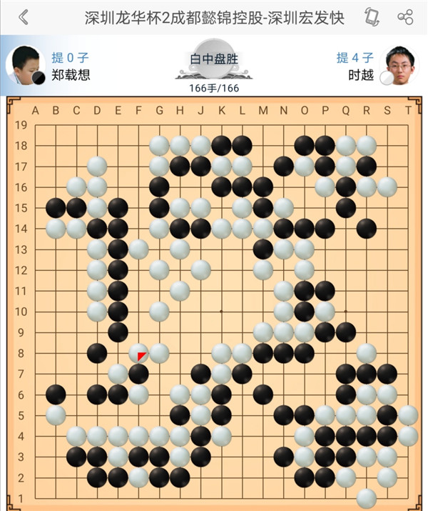 一臺快棋時越執白對陣鄭載想。開局黑棋打入左邊白棋模樣,之后黑棋棋形處理不佳,被白棋一路猛攻后損失慘重。之后白棋沒有再給黑棋機會活動勝利。