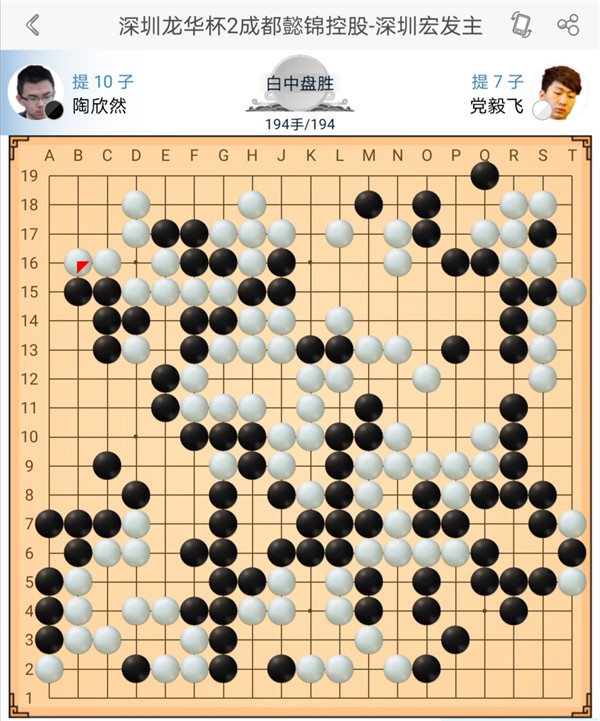 第二臺主將陶欣然執黑負于世界冠軍黨毅飛。中盤中腹作戰白棋失誤,轉換后黑棋優勢。之后左上角黑棋行棋過分,被白棋抓住機會吃住上方四子后一舉奠定勝局。
