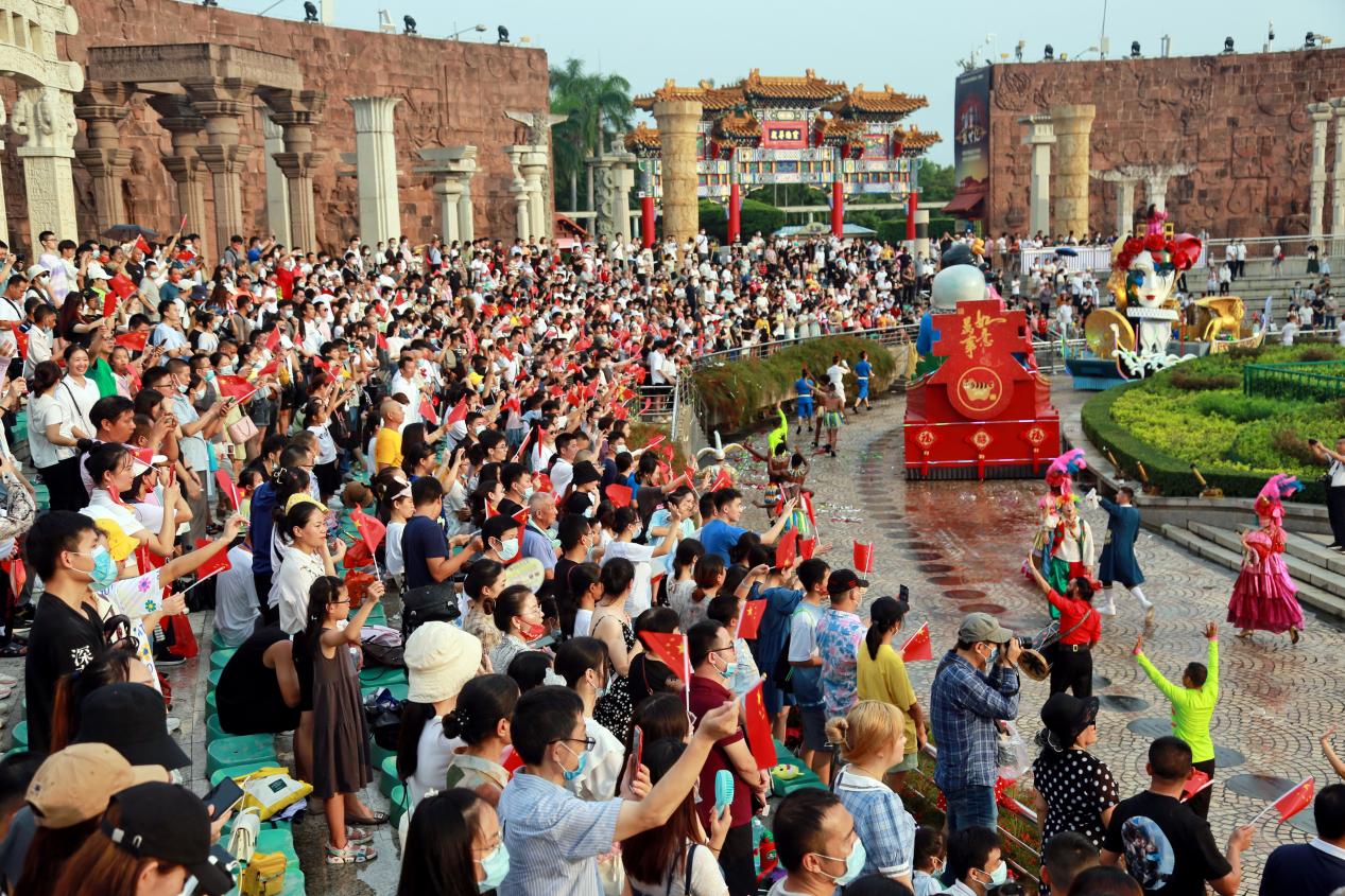 讀特客戶端·深圳新聞網2021年10月1日訊(記者 田志強 通訊員 陳嘉琳 黃海峰)今天,深圳世界之窗迎來第一波旅游小高峰。上午10:00整,世界之窗前廣場舉行了莊嚴的升國旗儀式,現場游客齊唱國歌,高亢嘹亮的歌聲響徹深南大道,激動人心。閘口處,俄羅斯歡樂家庭劇、異域風情迎賓禮以國際歡樂氛圍喜迎八方來客。