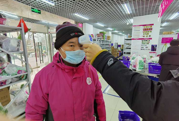 每日優鮮工作人員為配送員測量體溫