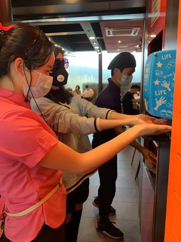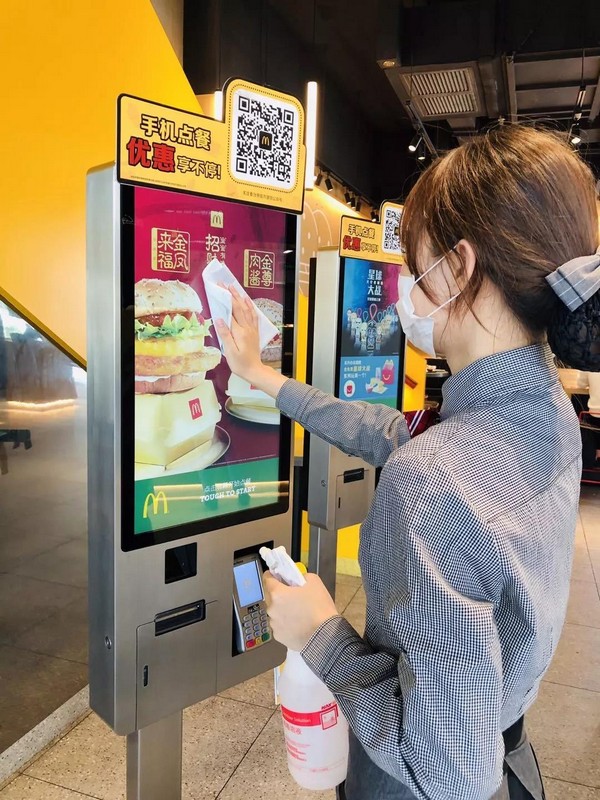 目前全國所有的麥當勞餐廳啟動上班員工測溫流程,并提高員工洗手消毒頻次,全國餐廳全員佩戴口罩。在餐廳為顧客提供免洗洗手液,對所有餐廳的通風系統和顧客常接觸的設施,強化消毒并增加頻次,包括大門把手、自助點餐屏、樓梯扶手、柜臺臺面、取餐區、桌椅、餐盤、兒童椅、兒童樂園等。