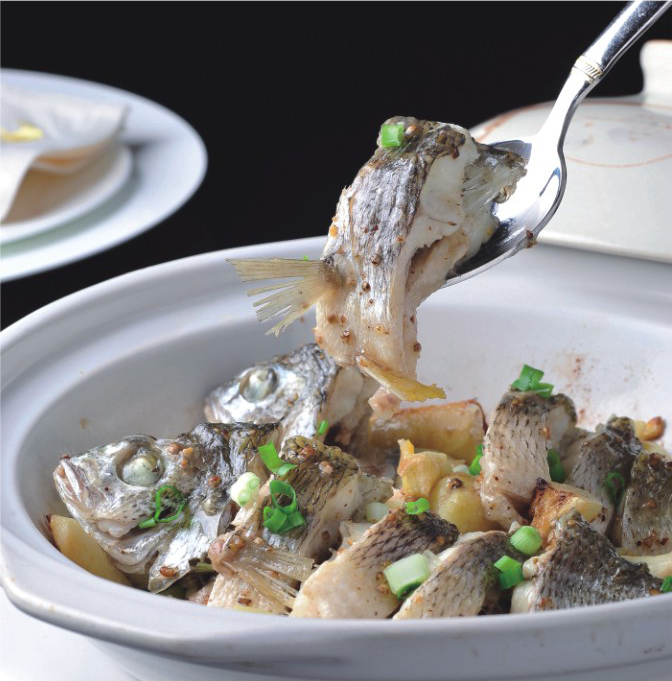 廣東人也會把立魚叫做“黃腳立”,立魚生長很慢,脂肪含量低,絲毫不見肥膩,最討女仔喜歡。立魚如果清蒸,則肉質偏韌;雷大廚改以鹽焗,用砂鍋爆香姜蔥蒜,魚肉先經鹽、糖、少許油、生粉和胡椒粒撈一撈,下鍋后蓋蓋子焗上五分鐘,入味后經砂鍋一焗,緊緊鎖住肉汁。