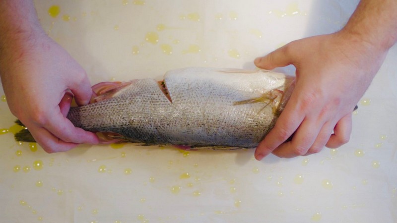 3、在牛油紙內倒入橄欖油,將鱸魚放在洋蔥和羅馬番茄上;