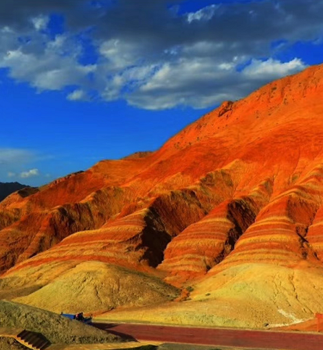 夜宿張掖丹霞公園,早晚之景,分外別致,既有朝陽(yáng)晚霞的映襯,也有山貌土質(zhì)的特性,構(gòu)筑成一幅幅天地合一的壯麗畫面,于是,我又寫下來(lái)“猜2”——-丹陽(yáng)裸照山土紅,晚霞斜映溝丘重,七色帶環(huán)競(jìng)爭(zhēng)艷,彩云作被情更濃!此又何處?