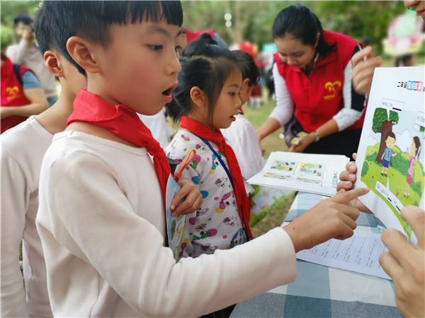 據(jù)悉,本次活動以闖關(guān)的形式,每年級各分10個關(guān)卡,每闖一關(guān)就獲得一個能量動物或者能量植物填補闖關(guān)卡的空白,各年級的學生需要在半小時內(nèi)將闖關(guān)卡的空白處填滿,才算闖關(guān)成功,獲得有校長贈言的書籍一本。關(guān)卡的設(shè)置以語文、數(shù)學和英語三個科別組成,其中,最受孩子們青睞的要數(shù)“筆架說話”這個關(guān)卡,孩子們把自己相像成筆架山的一員,然后介紹自己,有同學說:“我是筆架山的大樹,我可以給大家遮蔭,讓大家不用被太陽曬到。”、“我是筆架山的石頭,孩子們來筆架山玩的時候,可以把我們拼在一起做拼圖。”、“我想成為筆架山的暗綠繡眼鳥,就是嘴巴尖尖的,頭上綠綠的,眼睛邊上有點白色的那種,我要站在筆架山的枝頭上盡情歌唱,紅紅的火焰花為我做背景!”......孩子們通過豐富的相信力,盡情在老師與家長義工面前展現(xiàn)臨場的表達能力。