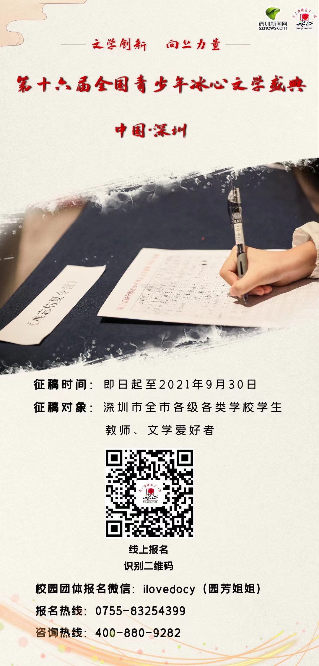 見圳客戶端·深圳新聞網(wǎng)2021年3月2日訊 為繼承和發(fā)揚中華文化及冰心文學(xué)精神,促進中華文化、中國現(xiàn)代化文學(xué)史更深入地植入深圳下一代青少年心中,奠定堅實的中國社會主義現(xiàn)代化建設(shè)根基,2021年“第十六屆全國青少年冰心文學(xué)盛典中國·深圳”正在愛好文學(xué)的師生學(xué)友們之間熱烈展開。