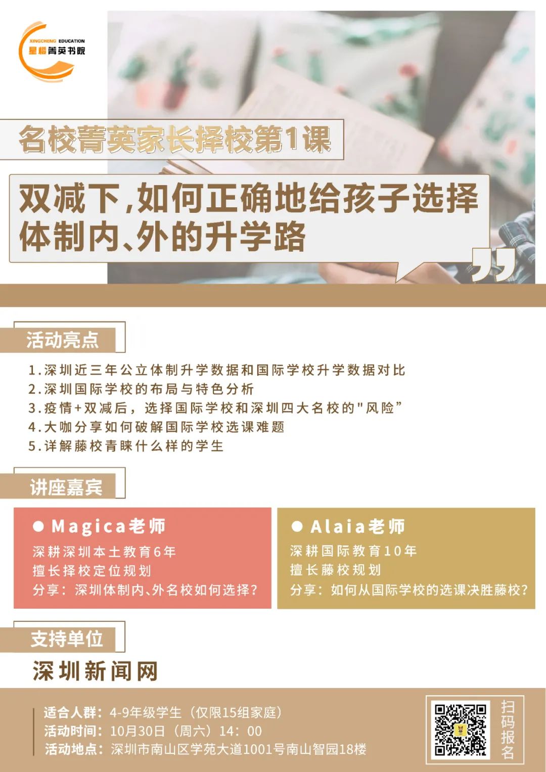 如果家長們在擇校方面有疑問,歡迎參加擇校君第一期【名校菁英家長下午茶】!一起探討:雙減之后,如何正確地給孩子選擇體制內、外的升學路?