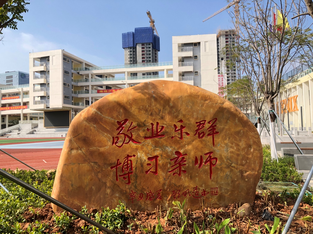 2021年底,學校啟用新東門,門右側墻壁上則是神采奕奕的校名:深圳市光明區鳳凰學校。經東門而入校園,呈現在眼前的是一塊碩大刻石,其辭曰:敬業樂群,博習親師。