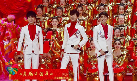 除夕之夜,以“大美中國夢 金雞報春來”為主題的雞年春晚如約而至。以“歡樂頌五美”與TFBOYS共同奉獻的《美麗中國年》開場,以李谷一、關牧村、高音、劉雨欣等新老藝人演唱《難忘今宵》結尾,全程42個節目亮相春晚舞臺,為除夕年夜飯捧上一道文化大餐,也為農歷雞年開了一個好頭。