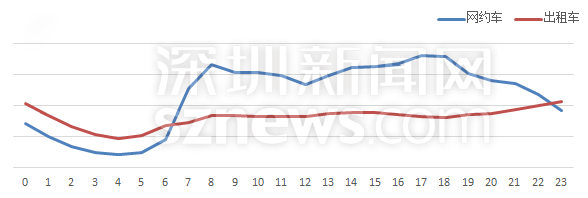 將網約車與出租車全天24小時行駛情況進行對比,發現網約車在日間活躍度明顯高于出租車,且在早晚高峰時段都有一個小的峰值,而出租車全日運行情況基本平穩。