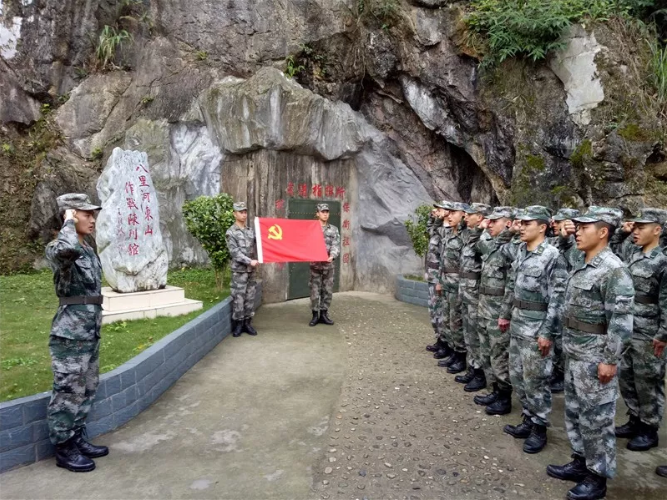 巖石旁,南部戰(zhàn)區(qū)陸軍某邊防旅“鋼七連”升起的國旗迎風(fēng)招展,與鮮紅的大字交相輝映。戰(zhàn)壕軍史館就坐落于此處。