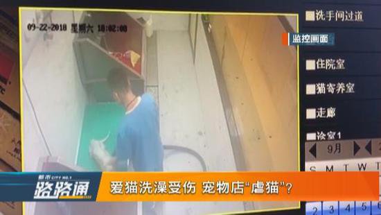 調取監控后發現,當時給貓吹毛的工作人員動作粗暴,在貓只抗拒躲閃的時候,有拖拽的動作,期間還把貓騰空甩起頭撞到墻上。