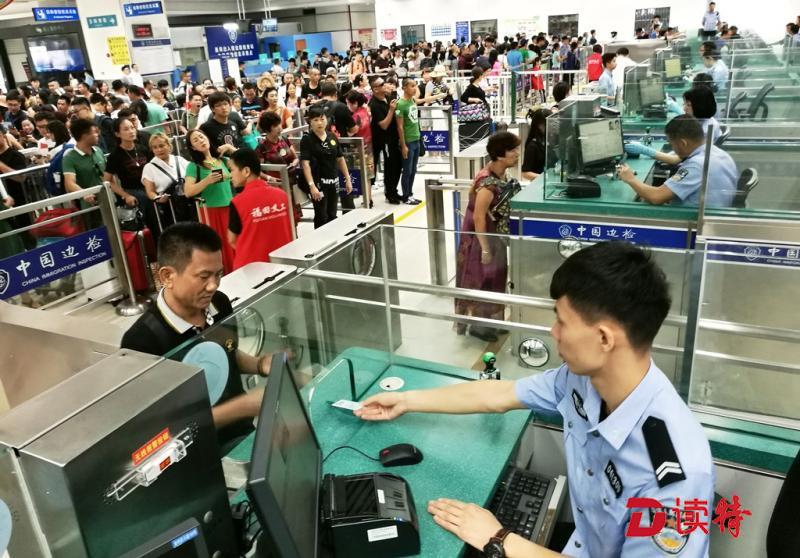 邊檢民警高效快捷為經皇崗口岸出境旅客辦理查驗手續。黃俊生攝