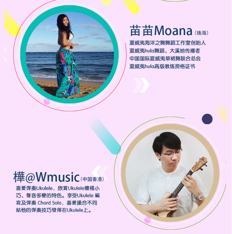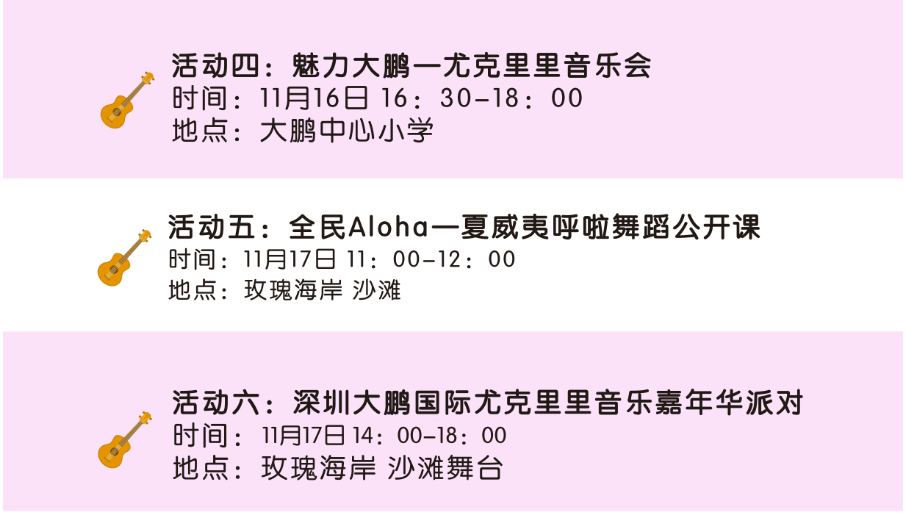 其中全民參與嘉年華音樂會11月17日的將會在深圳市玫瑰海岸沙灘舉辦,有深圳、香港(中國)、臺灣(中國)、美國、日本、廣州、中山、珠海等地的嘉賓和愛好者近50組表演者帶來4小時尤克里里盛會,表演者年齡跨度更是從5歲到60歲。嘉年華現場除了尤克里里音樂會,還將有Moana夏威夷呼拉舞風情體驗,中國臺灣尤克里里協會會長陳建廷新書《兒童尤克里里英文暢游》深圳首發,中國臺灣尤克里里世界大賽冠軍蔡皓怡原創專輯《航海日志》深圳首發,以及美國尤克里里音樂家、藝術家新專輯《粉色海豚》尤克里里專輯中國大陸首發。