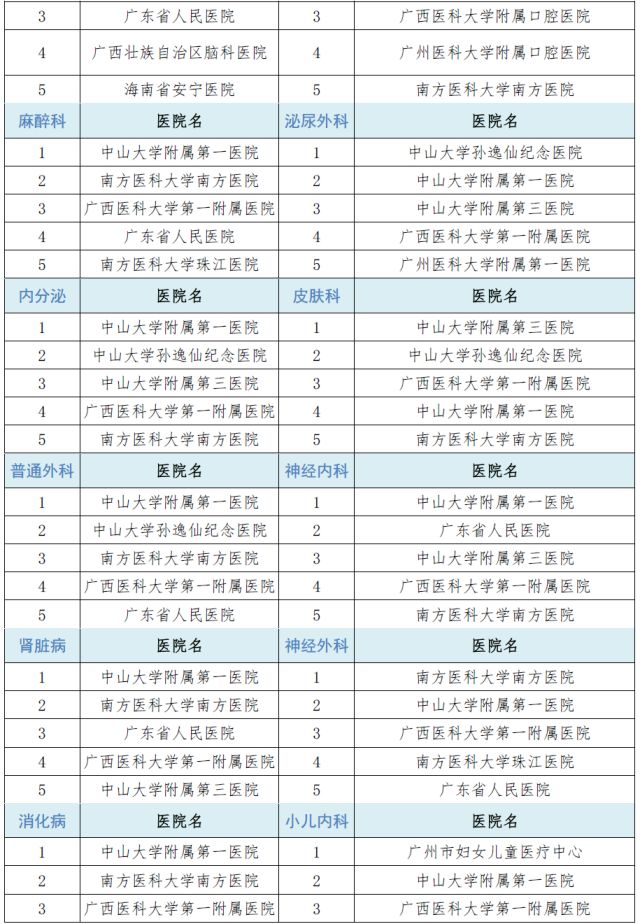 此外,廣東進入全國專科前十名的其他專科有:中山三院的風濕科;廣州市精神衛生中心(廣州惠愛醫院)的精神醫學;中山大學光華口腔醫院的口腔科;中山大學孫逸仙紀念醫院的泌尿外科、內分泌科;廣州市婦兒中心的小兒外科;廣州醫科大學附屬第一醫院的胸外科;中山大學附屬腫瘤醫院的胸外科與腫瘤學。