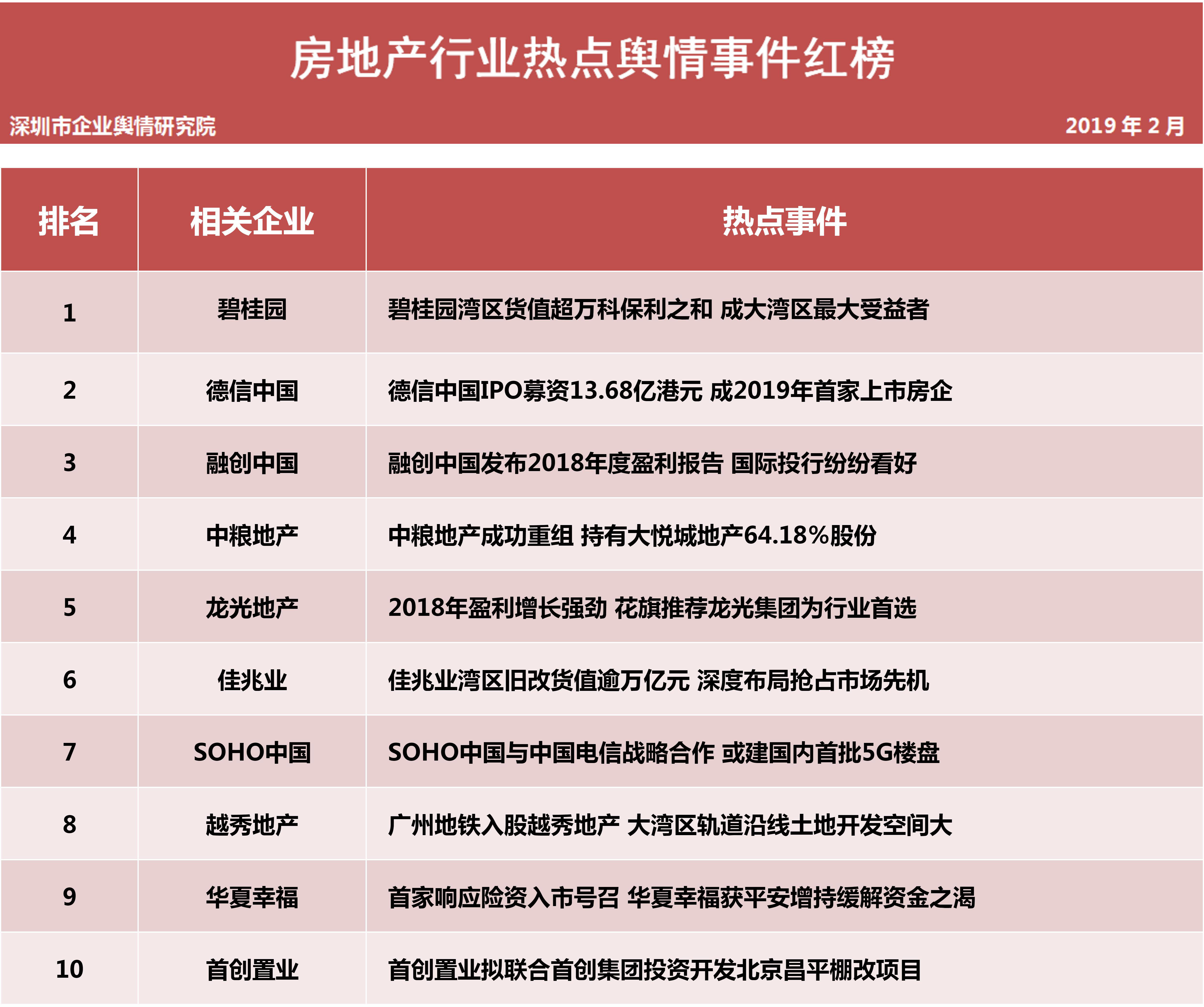 深圳新聞網2019年3月5日訊 (記者田志強 通訊員陳文光)3月5日,深圳企業輿情研究院發布第十三批企業輿情榜單。本次榜單重點聚焦房地產及醫藥保健兩個行業。房地產行業企業輿情榜單由房地產行業熱點輿情事件排行榜(紅、黑榜)及房地產企業公眾形象排行榜組成。