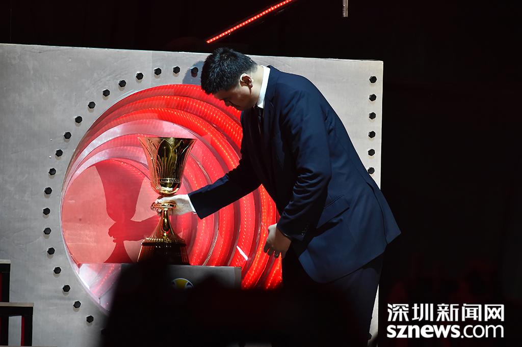 姚明將獎杯放入固定位置中
