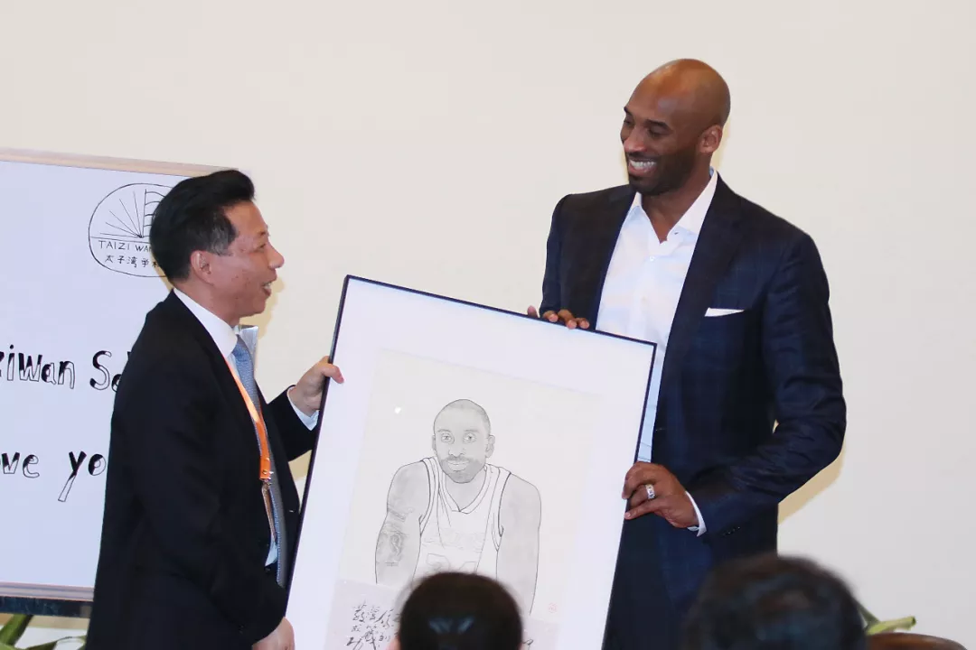 11點20分,科比在萬眾期待中出現,滿臉笑容地走下車接受太子灣學校學生的鮮花。