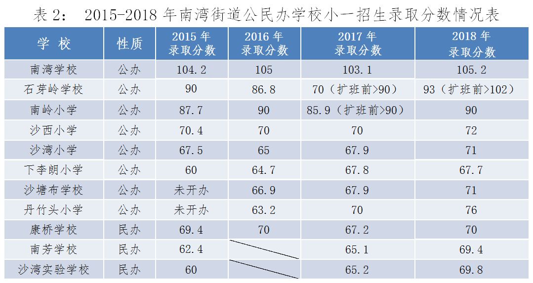 2015—2018年南灣街道公民辦學校小一招生錄取分數情況表