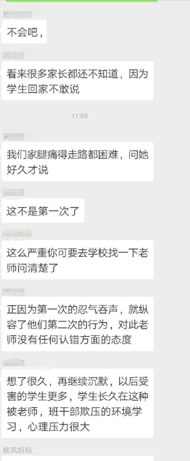 王先生把女兒的情況反映到家長群里,結果群里的家長紛紛表示,自己的孩子也反映當天遭遇到班長的毆打,有的孩子甚至“腿疼得難以走路”。而據孩子反映,其實類似的毆打在班上已經不止發生過一次。這名班長是女生,平時很受班主任的信任,經常利用班干部的權力隨意懲罰學生。“她曾經多次要求班上同學給自己帶零食吃,不然就會被撕作業和毆打,還威脅不準告訴家長。”王先生稱,家長們已經將情況反映給班主任,但是班主任的反應“相當冷淡”,只是說會了解一下情況。25日下午,記者電話聯系到了王先生女兒的班主任,他表示已經就此事對班長進行了批評教育,但對于班長此前多次毆打同學的行為他表示并不知情,“當初讓這名同學做班長是因為她成績好,而且守紀律。而且我覺得,孩子之間有些矛盾很正常。”班主任說。(記者 李東明)