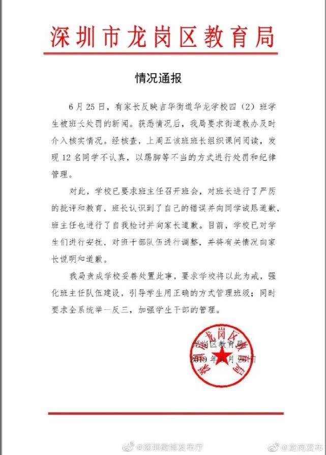 龍崗區教育局同時表示,將責成學校妥善處理,要求學校以此為戒,強化班主任隊伍建設,引導學生用正確的方式管理班級;同時要求全系統舉一反三,加強學生干部的管理。