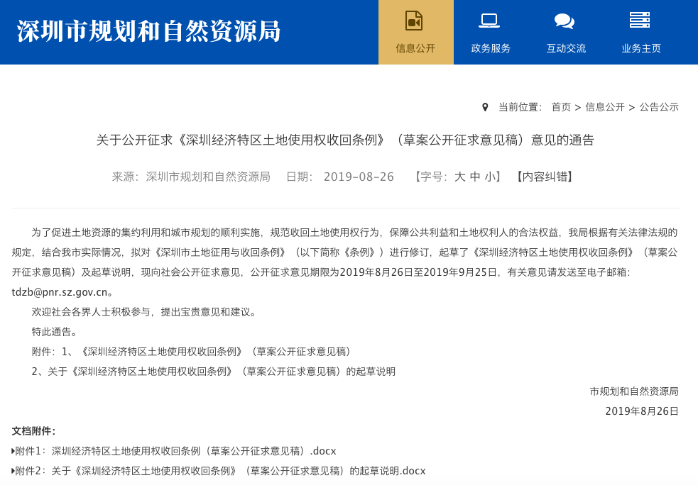 據了解,目前該《條例》(草案公開征求意見稿)正向社會公開征求意見,公開征求意見期限為2019年8月26日至2019年9月25日,有關意見請發送至電子郵箱:tdzb@pnr.sz.gov.cn。