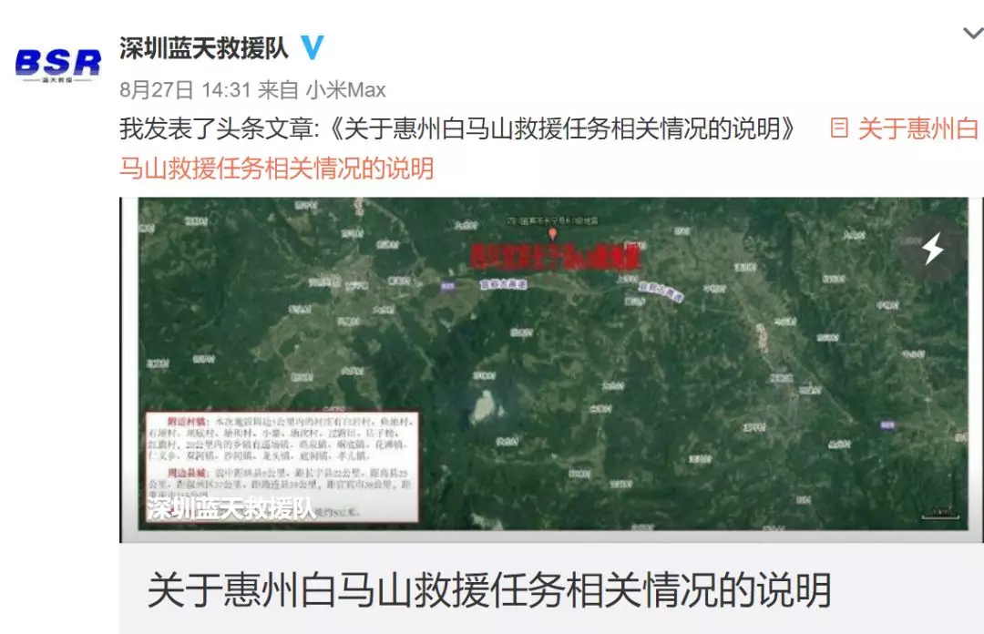 ▲深圳藍天救援隊官方微博通報接到求助
