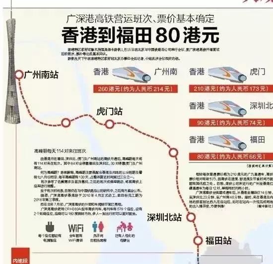 廣深港高鐵香港段,從香港西九龍總站發車,到深圳福田站、深圳北站、虎門站和廣州南站票價基本確定為80港元、90港元、210港元和260港元。