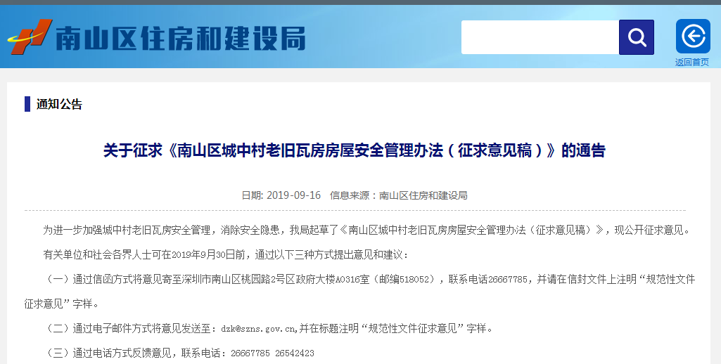 意見稿征集截止至9月30日,有關單位和社會各界人士有意見或建議的要及時進行反饋,更多情況可以登錄南山區住建局官網進行查看。