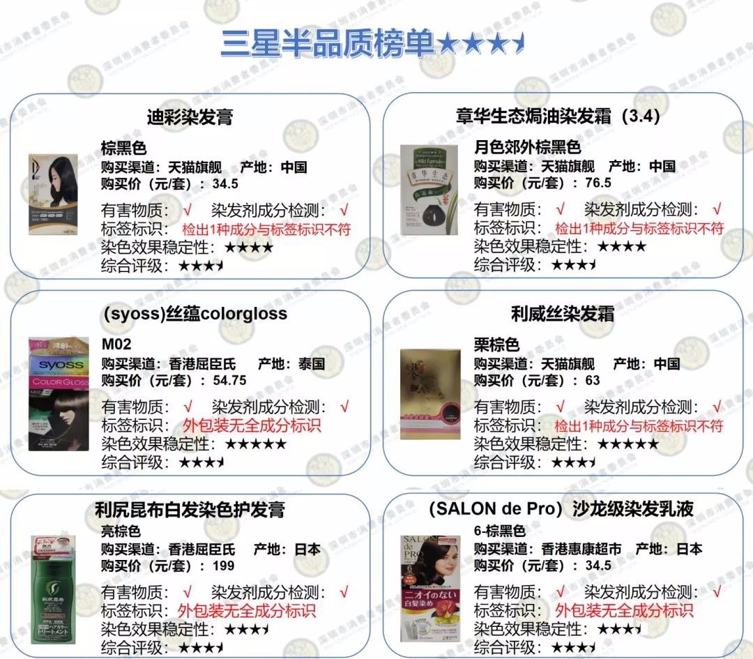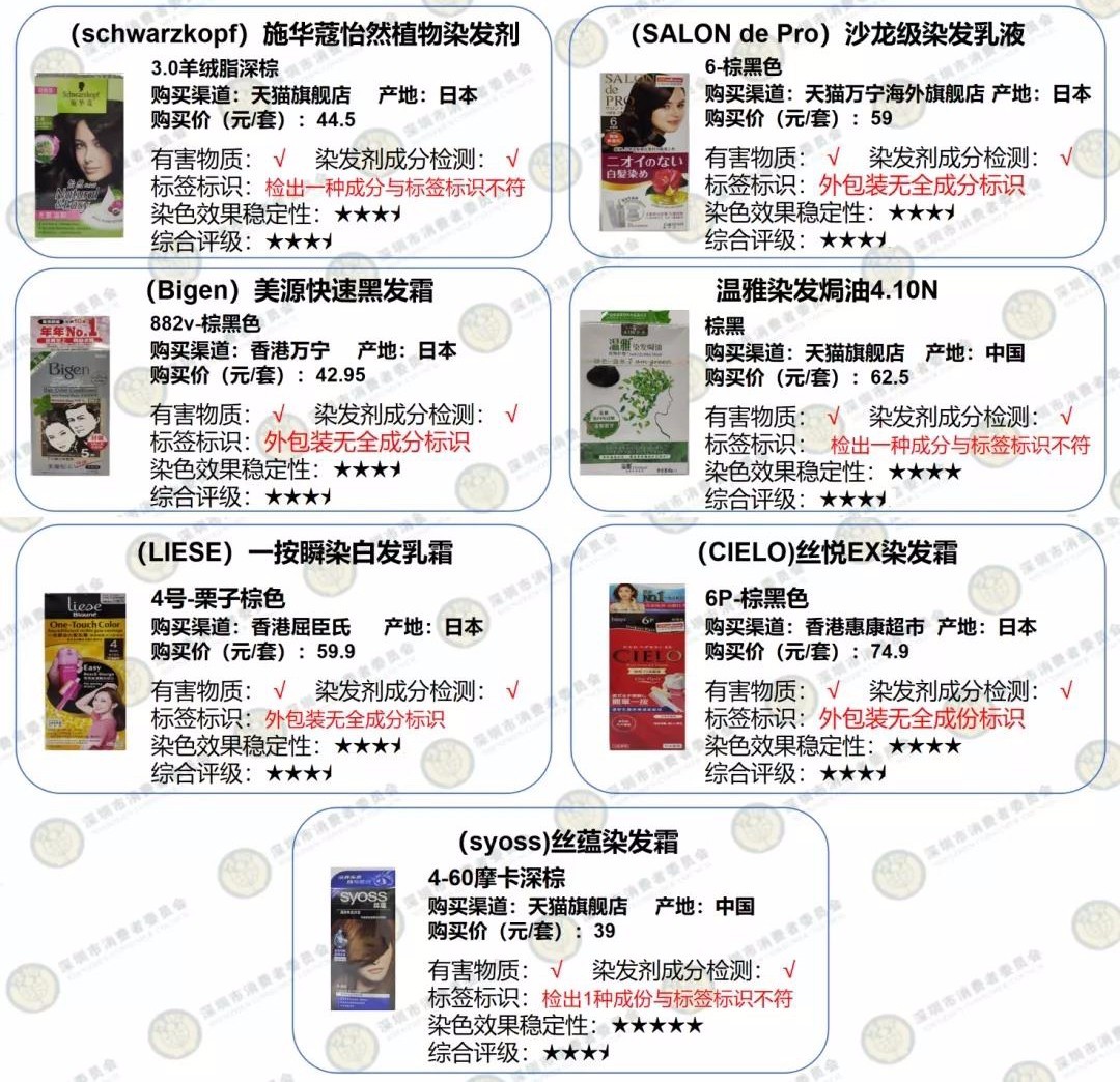 2款染發產品染發劑成分檢出量不符合本次比較試驗標準要求。此外,多款產品被檢測出個別成為與標簽標識不符問題。