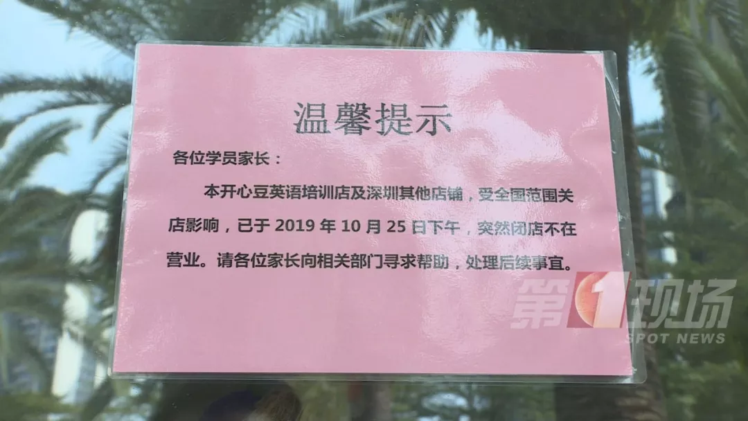 同時,家住龍崗的多名家長,今天也聚集在、鳳凰城商業中心里的一家開心豆少兒英語門前。這家店同樣是悄無聲息結業倒閉,人去樓空。商場管理方也貼出公告稱,這家店9月起就欠租,目前平湖長廊警務室已成立專門工作組。