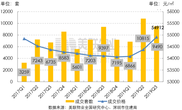 2019年第三季度二手住宅市場延續第二季度成交熱度,共備案20852套二手住宅,再創三年來季度成交量新高,較今年第二季度上升0.6%,同比去年第三季度上升8.9%;總成交面積約173.80萬㎡。美聯物業(深圳)藍籌住宅價格方面,今年第三季度全市二手住宅的成交均價為55655元/㎡,較第二季度上漲0.7%,同比去年第三季度上漲0.1%。