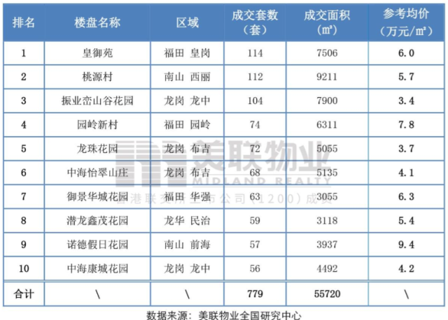 不過,與新房市場不同的是,二手住宅成交分布比較均勻。在第三季度二手住宅成交TOP10中,前三甲分別來自福田、南山和龍崗三區。其中,福田皇崗片區的皇御苑以114套的成交量位居榜首。
