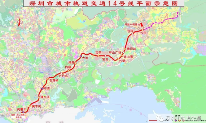 地鐵14號線全長約50.34km,共設站17座、停車場1座、車輛段1座、主變電所4座,采用自動化無人駕駛,最高設計速度為120km/h,預計2022年竣工。它連接起福田中心區、布吉、橫崗、大運新城、坪山中心、坑梓,支撐整個東部發展軸,覆蓋東部地區南北向交通需求走廊。