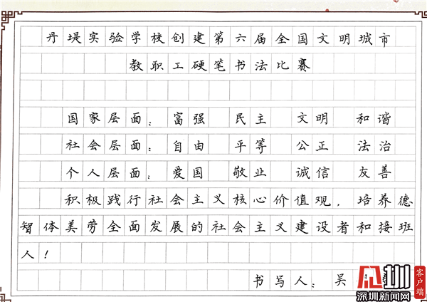 見圳客戶端·深圳新聞網10月29日訊(見圳客戶端、深圳新聞網記者 潘寶儀 通訊員 袁小俊 圖/朱雅琪 ) 為落實立德樹人總目標、培育和踐行社會主義核心價值觀,創建文明城市,積極倡導全校教職工勤練教學基本功,提高教師綜合素養,豐富課余生活,展示丹堤實驗學校教職工風采,學校于10月25日舉行了“創建第六屆全國文明城市教職工硬筆書法比賽”。