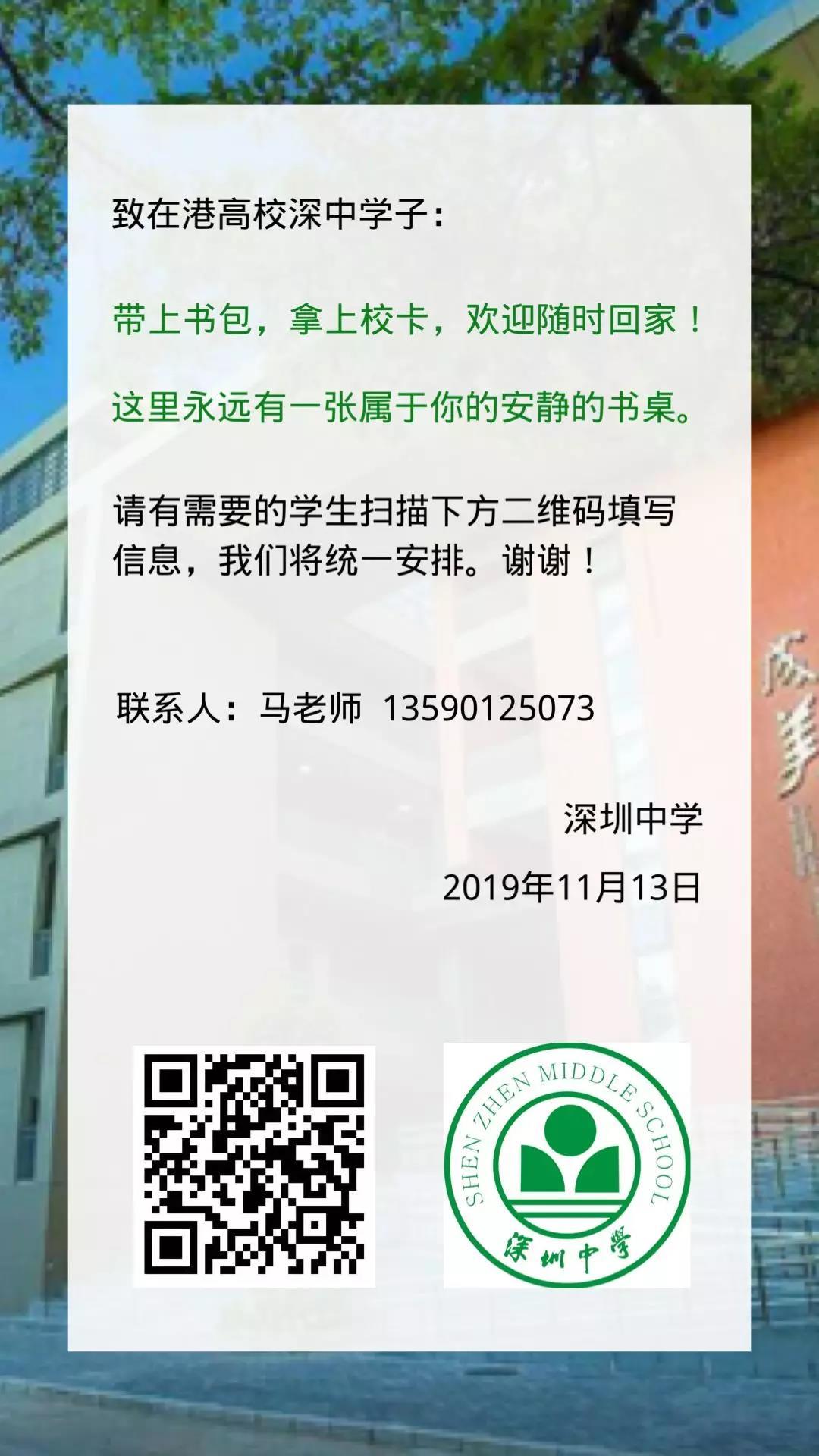 見圳客戶端·深圳新聞網2019年11月14日訊 繼香港中文大學(深圳)發文表示為內地在港就讀學生提供臨時免費住宿后,深圳中學今天也在官方微信公號中致信在港高校深中學子,只要拿上校園卡,深中隨時歡迎學子們回家!學校將對有需要的學生統一進行安排。
