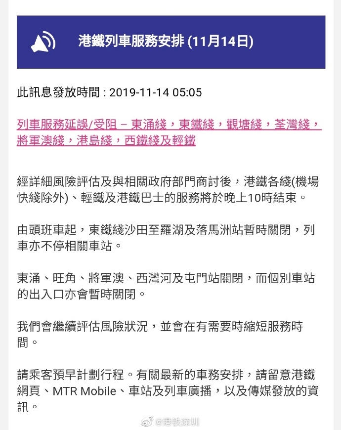 據(jù)港鐵官網(wǎng)目前最新消息,11月14日,港鐵各線(機(jī)場快線除外)、輕鐵及港鐵巴士的服務(wù)將于晚上10時結(jié)束,東涌線、東鐵線、觀塘線、荃灣線、將軍澳線、港島線、西鐵線及輕鐵列車服務(wù)延誤/受阻。