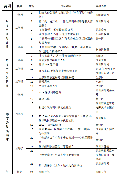 見圳客戶端·深圳新聞網2019年12月5日訊 12月5日上午10時,“‘圳能量’2019深圳網絡盛典”在深圳IBC環球商務中心mall拉開帷幕。網絡盛典現場公布了“第十三屆深圳網絡文化獎”、“深圳年度網絡正能量十件大事”、“深圳年度網絡答政十佳單位”、“深圳年度網民最喜愛幸福街道”、“深圳年度政務公開優秀單位”、“深圳年度優秀政務新媒體”、“深圳年度公共服務口碑獎”、“深圳年度政務服務工作創新獎”、“深圳年度基層民生服務工作創新獎”名單,并對獲獎代表進行頒獎。