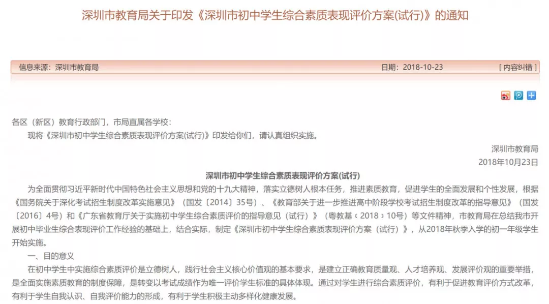 ▲深圳市教育局此前發布的《深圳市初中學生綜合素質表現評價方案(試行)》