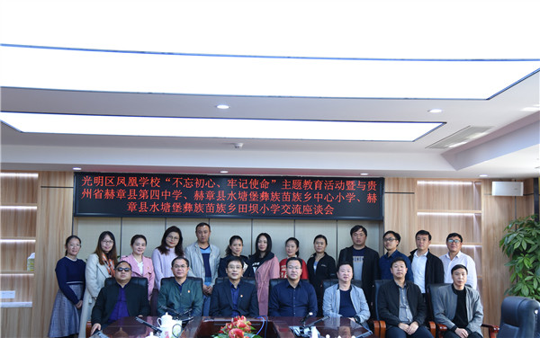 研討課后,光明區(qū)委教育工委副書(shū)記嚴(yán)亮,鳳凰學(xué)校校長(zhǎng)華建明,校長(zhǎng)助理王珍、何運(yùn)敏等與赫章縣教育同仁共同參加了 “不忘初心、牢記使命”主題教育交流座談會(huì)。