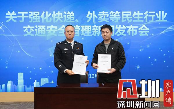 深圳市交警局副局長馮新毅與相關企業代表簽訂承諾書。