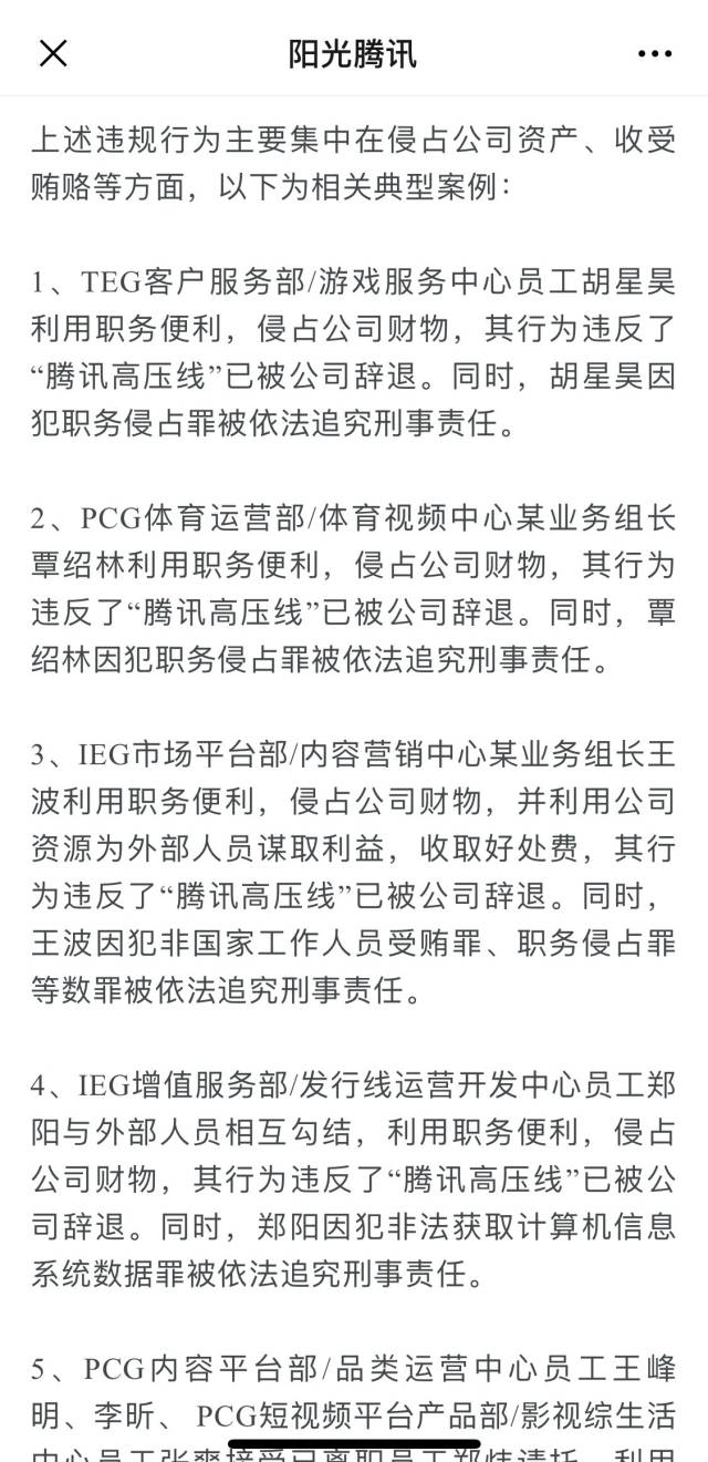 2、PCG體育運營部/體育視頻中心某業務組長覃紹林利用職務便利,侵占公司財物,其行為違反了“騰訊高壓線”已被公司辭退。同時,覃紹林因犯職務侵占罪被依法追究刑事責任。