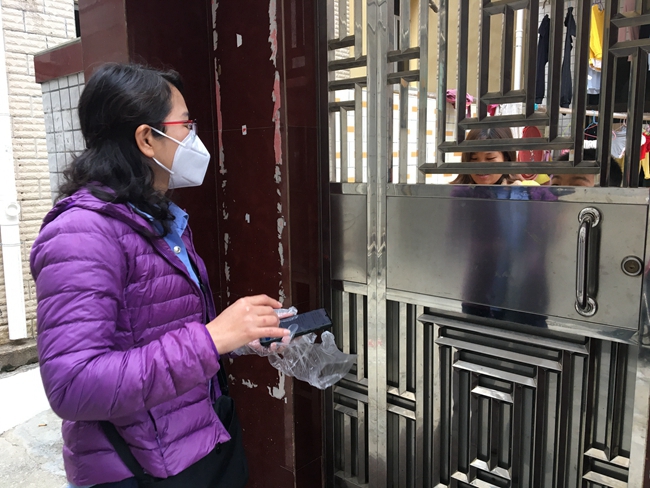 今天跟往常一樣,戴口罩、戴手套,這是我的全副武裝,最近半個月天天是這樣,每天任務也是模塊化,打電話打電話勸返、上門發告示、排查報數據、站崗測體溫,還要做宣傳,提醒阿叔阿嬸一定要戴口罩,老年人總是忘,讓人很頭疼。在葵涌社區工作16年了,大家都很熟悉,我的工作還算好做,都不容易,健康的人要惜福。
